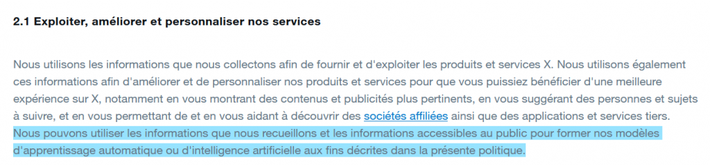 X (anciennement Twitter) par exemple, peut utiliser les publications de ses internautes pour former ses modèles d’apprentissage automatique et d’intelligence artificielle, mais ne permet plus à des partis tiers de le faire.